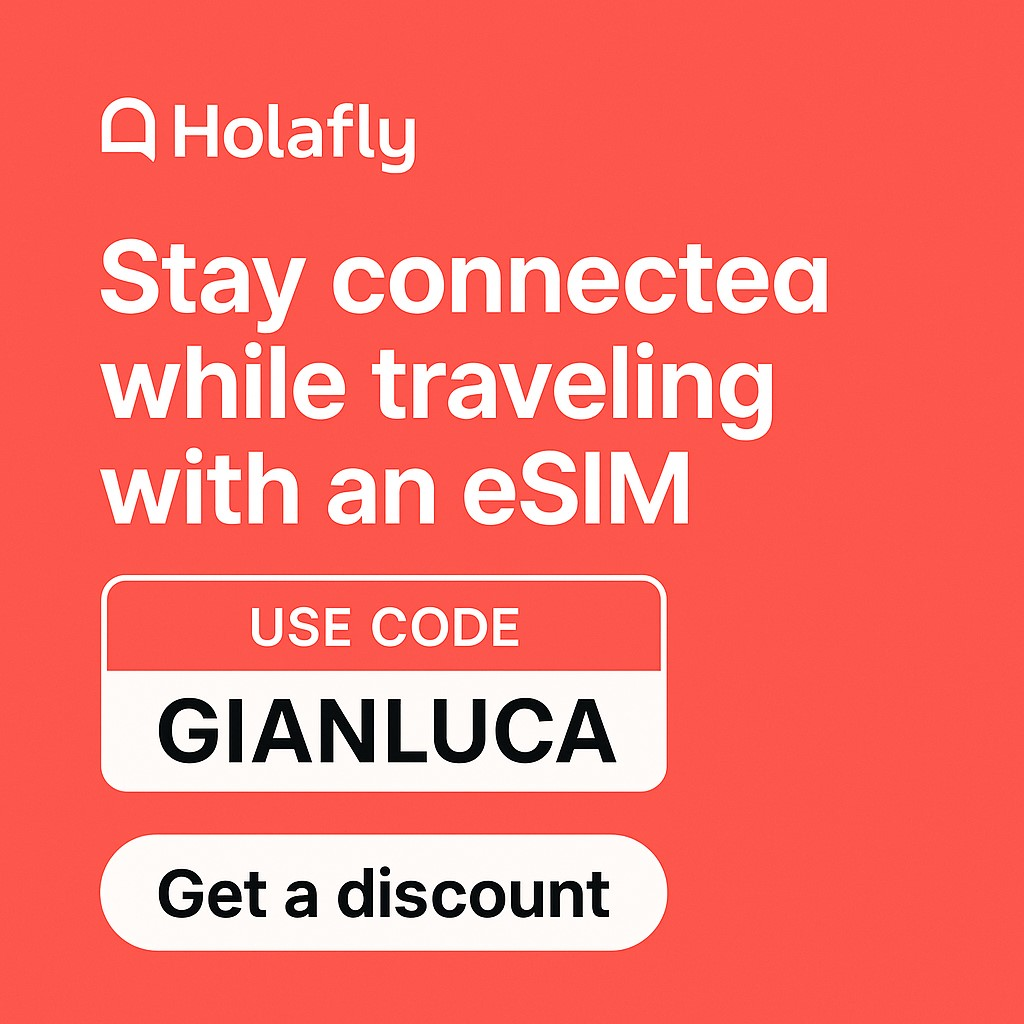 Utilizza il codice sconto GIANLUCA al momento dell’acquisto su www.holafly.com per ottenere uno sconto immediato sul tuo piano dati.